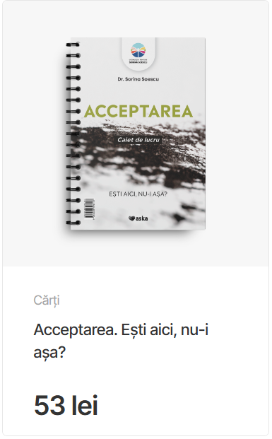 Acceptarea. Ești aici, nu-i așa? este caietul de lucru care completează această călătorie, oferind 12 exerciții concepute pentru a fi parcurse în ritmul fiecărui cititor. Aceste exerciții ajută la integrarea acceptării în viața de zi cu zi, prin introspecție și practică activă. Fie că este utilizat zilnic pentru o experiență intensivă sau săptămânal pentru o procesare mai profundă, caietul de lucru oferă un instrument esențial pentru cei care doresc să trăiască mai conștient.